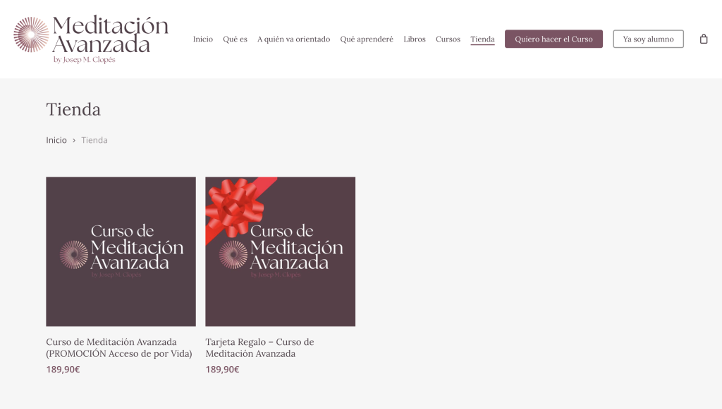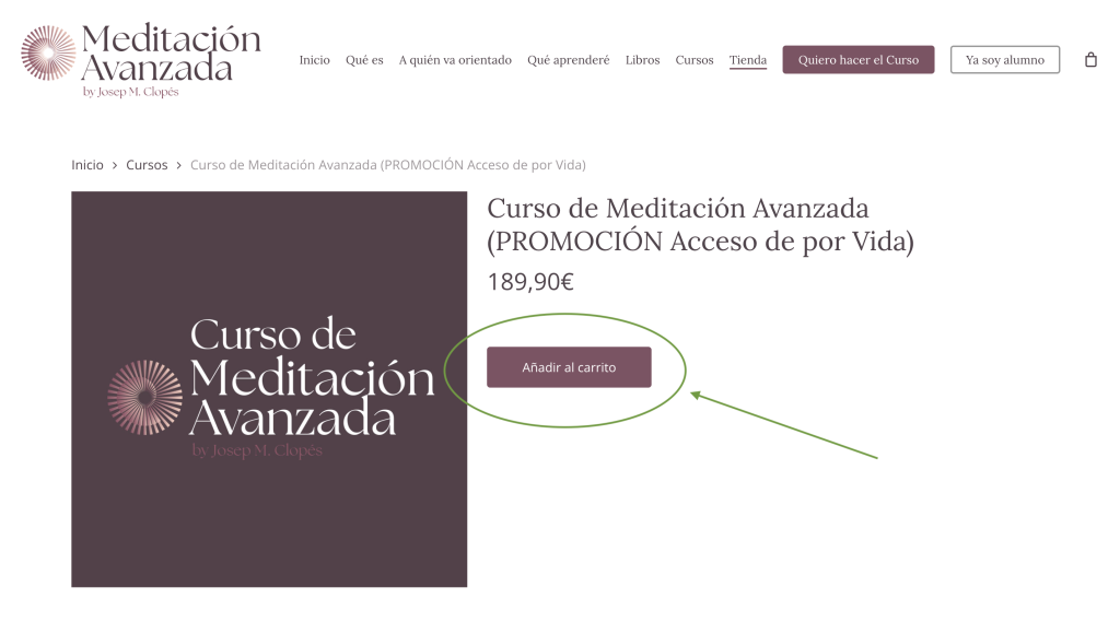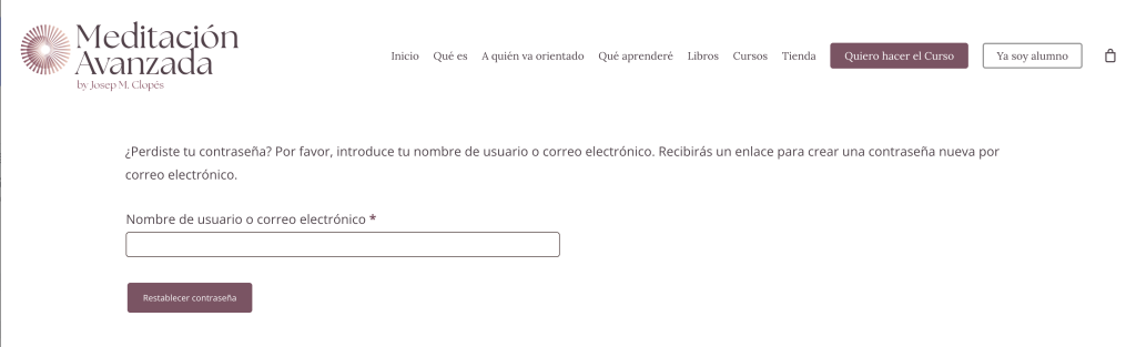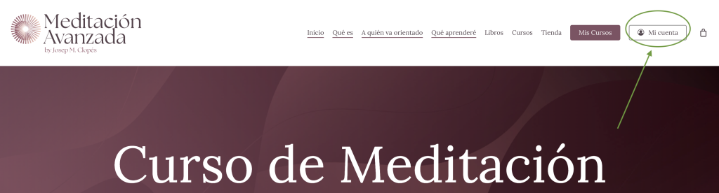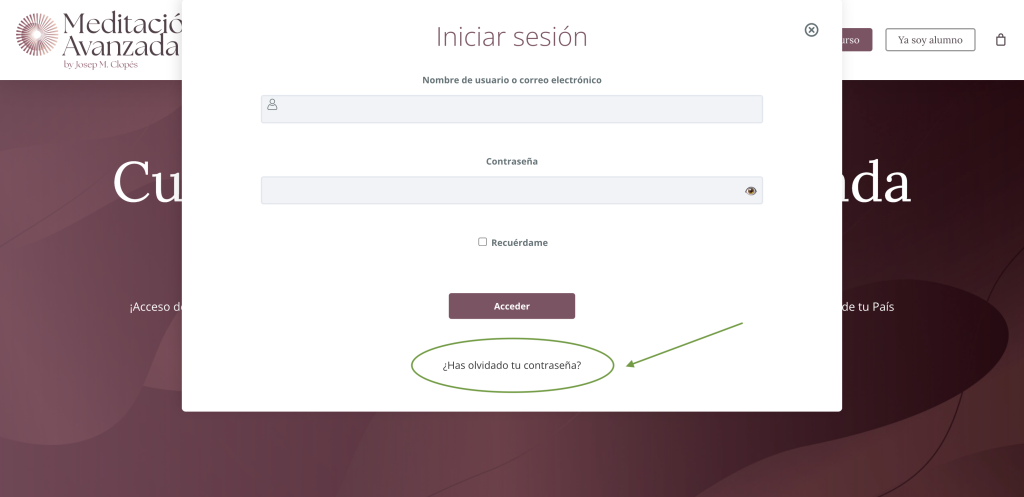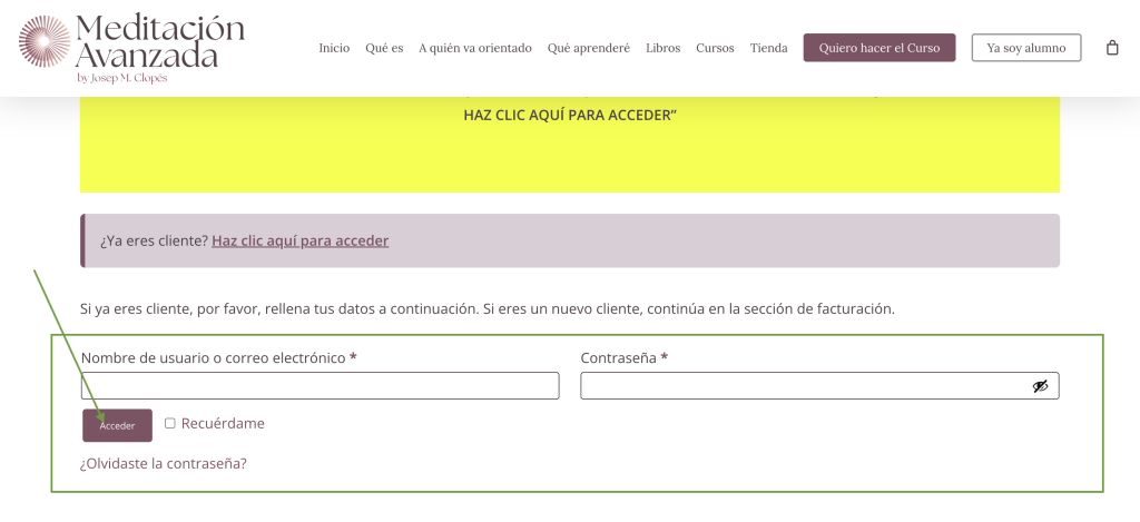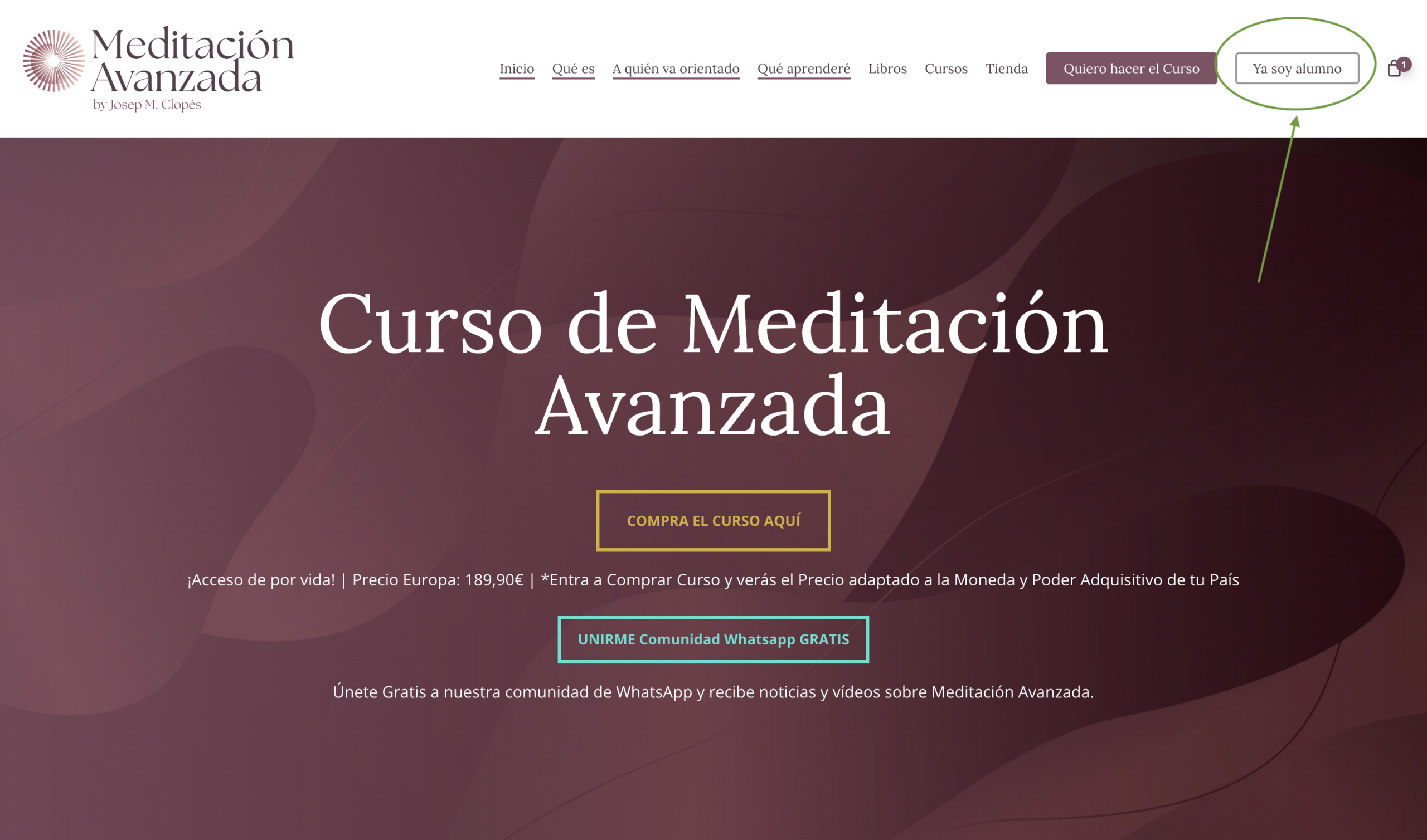 Opción 1. Clicar en el menú principal en el botón “Ya soy alumno” e introducir tu usuario y contraseña para iniciar sesión. Una vez hayas iniciado sesión podrás comprar el Curso Superior de Meditación Avanzada sin ningún problema.