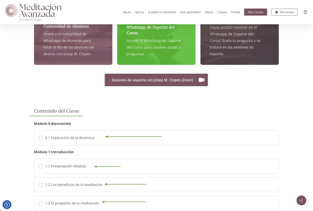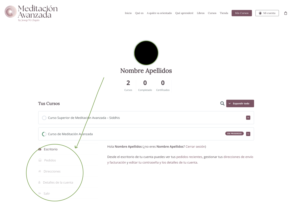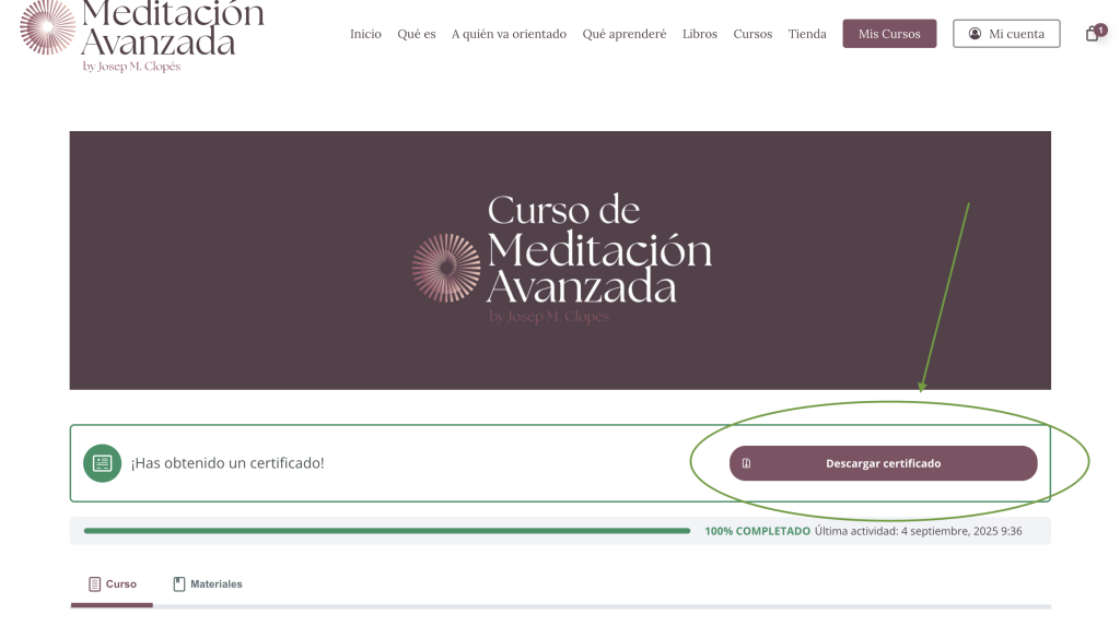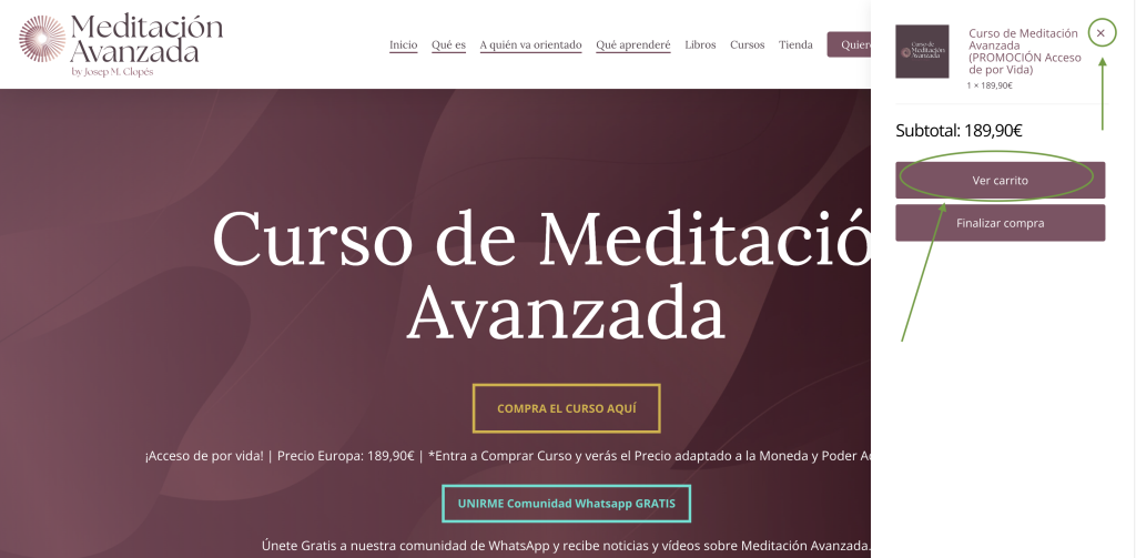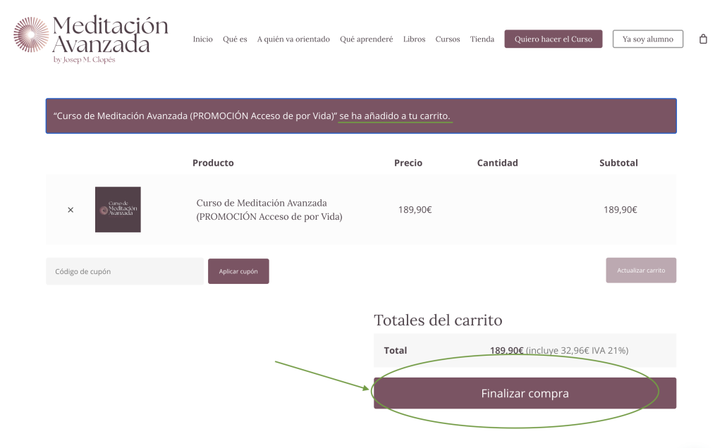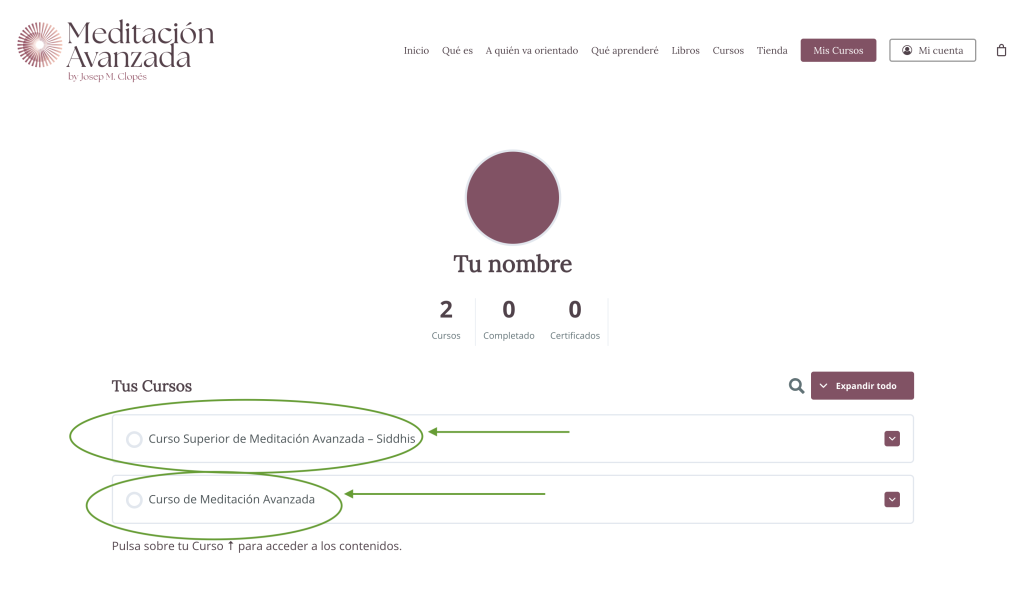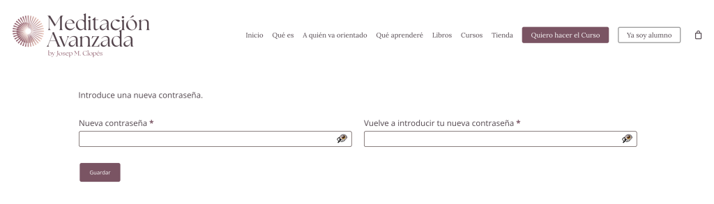Opción 1. Clicar en el menú principal en el botón “Ya soy alumno” e introducir tu usuario y contraseña para iniciar sesión. Una vez hayas iniciado sesión podrás comprar el Curso Superior de Meditación Avanzada sin ningún problema.